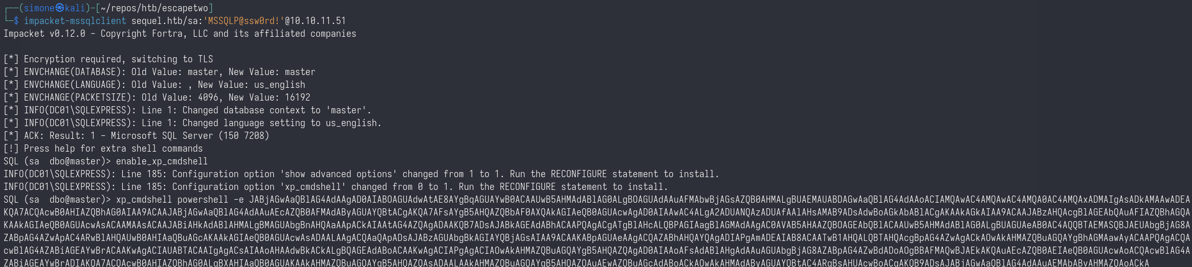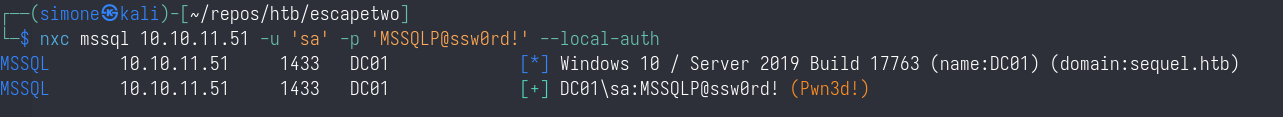 impacket-mssqlclient sequel.htb/sa:'MSSQLP@ssw0rd!'@10.10.11.51
