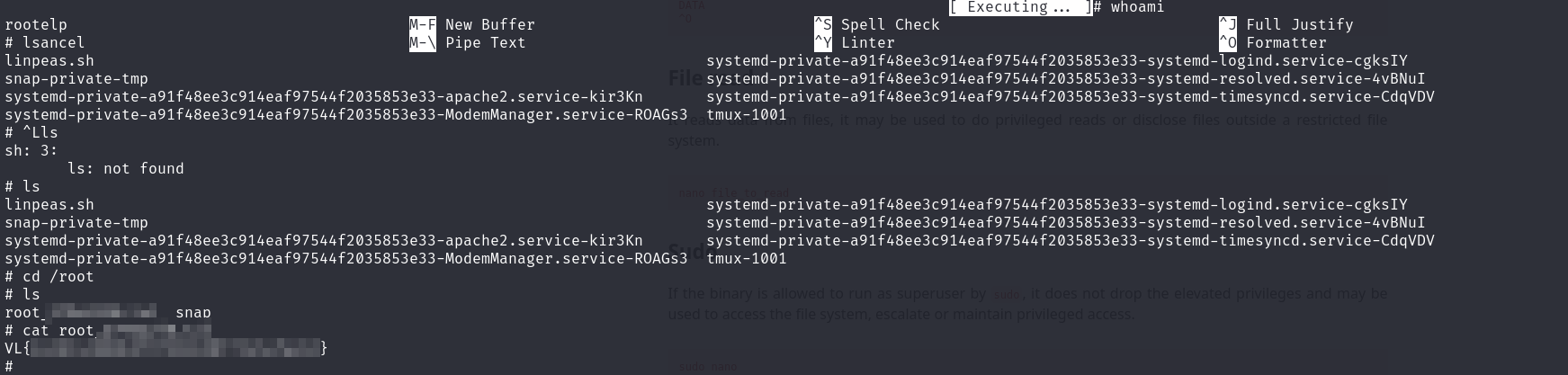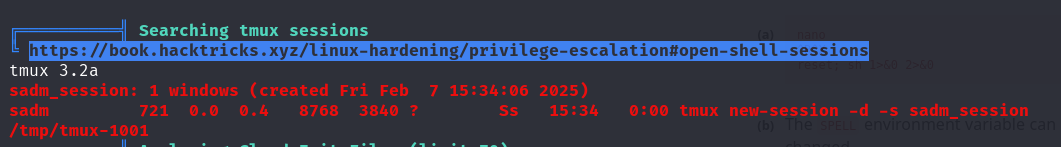 The tmux session contains the plaintext credential for the user sadm and reveals that we can run nano as root.