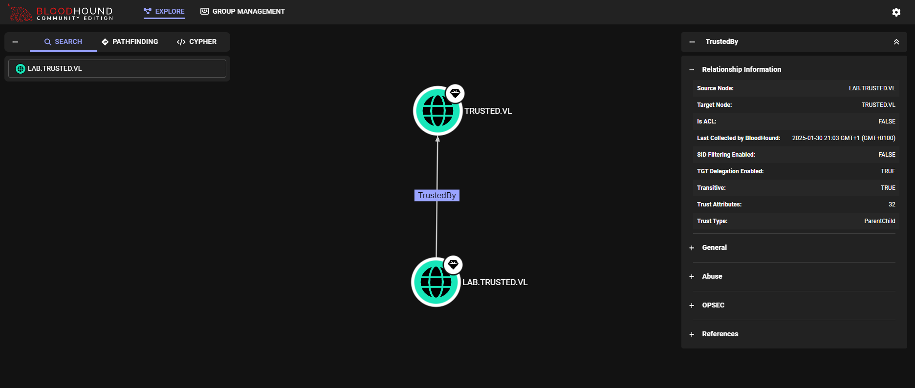Using Bloodhound we can notice how we have bidirectional parent-domain trust between trusted.vl and lab.trusted.vl
